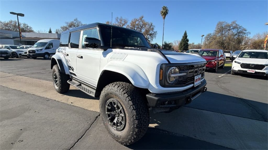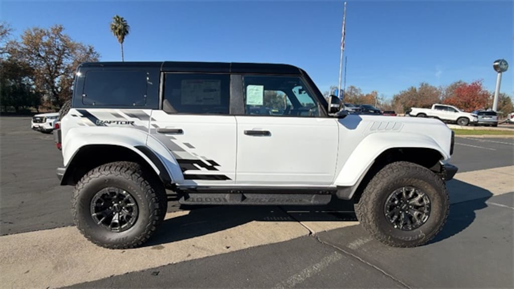 Vehicle is equipped with Equipment Group 374A Lux Package, Raptor Black Appearance Package (Gloss Black Sideview Mirror Skull Caps, Interior Carbon Fiber Pack, and Wheels: 17" Dark Carbonized Gray Alloy Painted), 12 Speakers, 4-Wheel Disc Brakes, ABS brakes, Air Conditioning, Alloy wheels, AM/FM radio: SiriusXM with 360L, Auto High-beam Headlights, Auto-dimming Rear-View mirror, Automatic temperature control, Black Appearance Raptor Side Graphic, Brake assist, Compass, Connected Navigation, Convertible HardTop, Convertible roof lining, Delay-off headlights, Driver door bin, Driver vanity mirror, Dual front impact airbags, Dual front side impact airbags, Electronic Stability Control, Emergency communication system: 911 Assist, Engine Block Heater, Exterior Parking Camera Rear, Front anti-roll bar, Front Bucket Seats, Front Center Armrest, Front dual zone A/C, Front fog lights, Front License Plate Bracket, Front reading lights, Front wheel independent suspension, Fully automatic headlights, Garage door transmitter, Glass rear window, Hard Top Sound Deadening Headliner, Heated door mirrors, Heated front seats, Heated steering wheel, Illuminated entry, Integrated roll-over protection, Internet access capable: FordPass Connect, Leather Shift Knob, Leather-Trimmed/Vinyl Bucket Seats, Low tire pressure warning, Marine Grade Vinyl Bucket Seats, Navigation system: Connected Navigation, Occupant sensing airbag, Outside temperature display, Overhead airbag, Overhead console, Panic alarm, Passenger door bin, Passenger vanity mirror, Power door mirrors, Power steering, Power windows, Radio data system, Radio: B&O Sound System by Bang & Olufsen, Rear anti-roll bar, Rear seat center armrest, Rear window defroster, Rear window wiper, Rear-Window Defroster & Washer, Remote keyless entry, Security system, Shadow Black Painted Hard Top, SiriusXM w/360L, Speed control, Split folding rear seat, Steering wheel mounted audio controls, SYNC 4, Tachometer, Telescoping steering wheel, Tilt steering wheel, Traction control, Trip computer, Turn signal indicator mirrors, Variably intermittent wipers, Voltmeter, and Wheels: 17" Black High Gloss-Painted Aluminum.