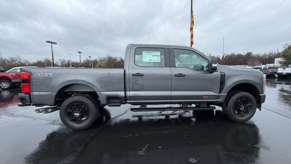 Vehicle is equipped with 360-Degree Camera Package (360-Degree Camera, BLIS with Cross-Traffic Alert, LED Center High-Mounted Stop Lamp (CHMSL) Camera, and Rear Parking Sensors), Ford Connectivity Package (1-Year Included), GVWR: 10,000 Lb Payload Package, GVWR: F-250 >10K Package, High Capacity 11.6" Axle Upgrade Package, Internet access capable: 5G Modem - Ford Connectivity Package, STX Appearance Package (Body-Color Front Bumper, Body-Color Rear Bumper, Cloth 40/20/40 Split Bench Seat, Color-Coordinated Full Carpet with Floor Mats, LED Fog Lamps, Painted Grille, and Wheels: 18" Ebony Black Painted Aluminum), XL Driver Assist Package, 4WD, 17" Argent Painted Steel Wheels, 4-Wheel Disc Brakes, 6 Speakers, ABS brakes, Air Conditioning, AM/FM radio, Brake assist, Compass, Delay-off headlights, Dual AGM 68 AH Battery, Dual front impact airbags, Dual front side impact airbags, Electronic Stability Control, Emergency communication system: SYNC 4 911 Assist, Exterior Parking Camera Rear, Front anti-roll bar, Front Center Armrest w/Storage, Front License Plate Bracket, Front reading lights, Fully automatic headlights, HD Vinyl 40/20/40 Split Bench Seat, Heated door mirrors, Illuminated entry, Low tire pressure warning, Outside temperature display, Overhead airbag, Overhead console, Panic alarm, Passenger vanity mirror, Platform Running Boards, Power door mirrors, Power steering, Power windows, Radio: AM/FM Stereo with MP3 Player, Rear reading lights, Rear step bumper, Remote keyless entry, Security system, Speed control, Split folding rear seat, Steering wheel mounted audio controls, SYNC 4, Tachometer, Telescoping steering wheel, Tilt steering wheel, Traction control, Trailer Brake Controller, Trip computer, Turn signal indicator mirrors, and Variably intermittent wipers.